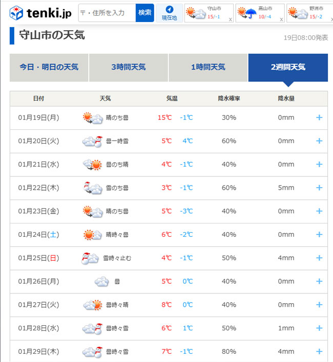 1月12日(月・祝)三連休最終日、寒い一日になりそう